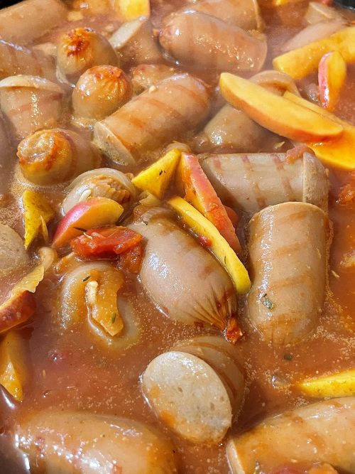 Packet devilled sausages are great and I do use them, but there is something nice about making things from scratch. This comes together quickly, especially if you use precooked sau
