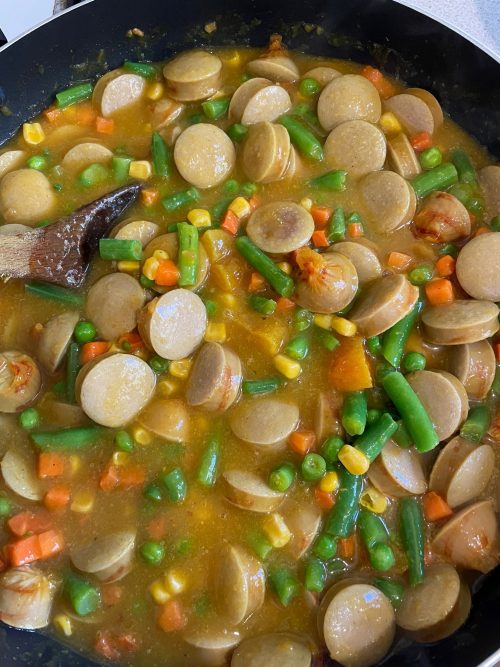 I have made this with either pre-cooked sausages and frankfurters, which are a cheaper option and still tastes good. Using chorizo or some other type of cooked sausage/salami will